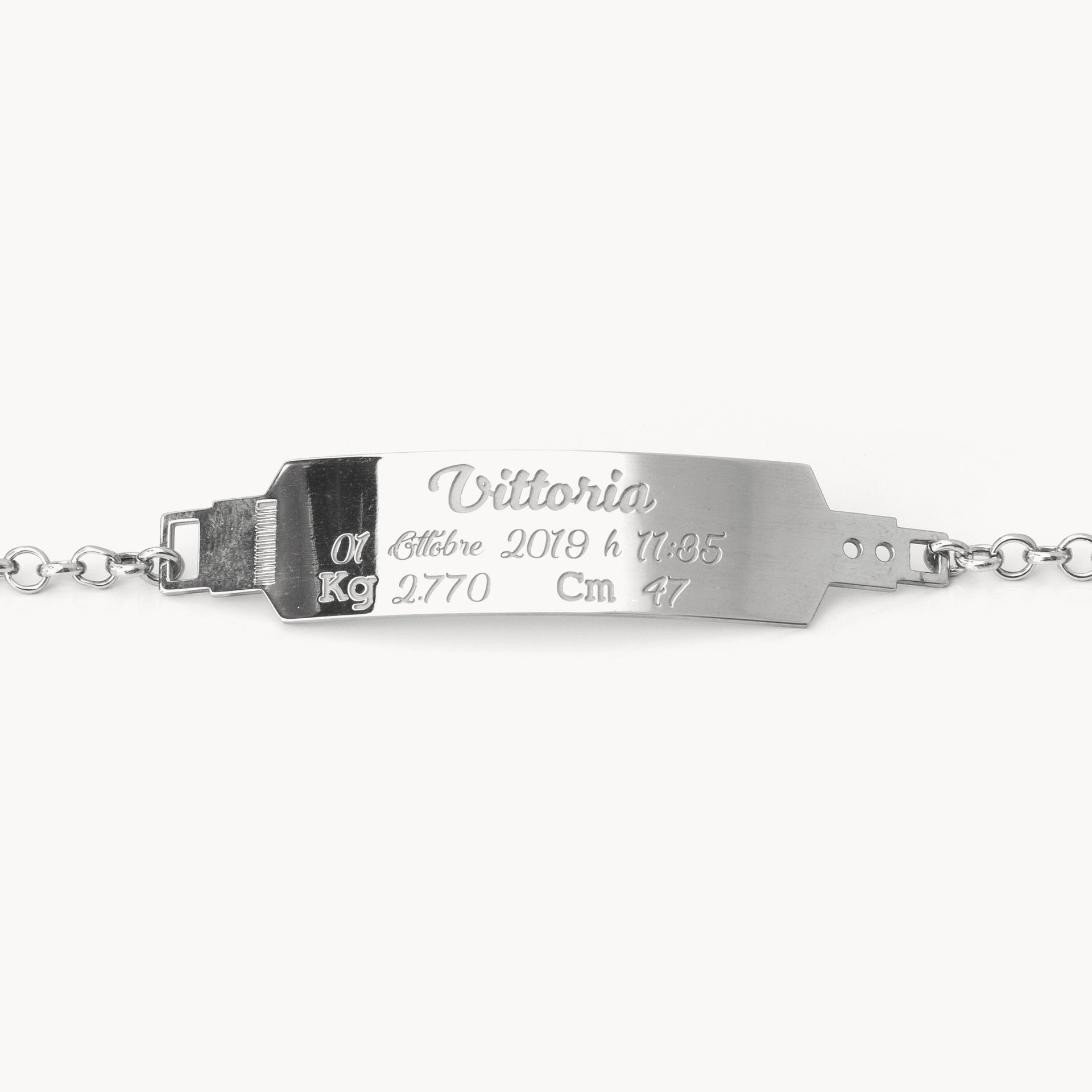 Il "Bracciale Nascita" è un braccialetto elegante e raffinato, realizzato in argento tit. 925 con una catenina rolo laterale e una targhetta rettangolare incisa. La targhetta è personalizzabile con la data di nascita, rendendo questo braccialetto un ricordo indelebile di un evento speciale come la nascita di un figlio, un nipote o un amico. La semplicità ed eleganza del braccialetto lo rendono un regalo perfetto per la mamma, la nonna o per il bambino stesso. La catenina rolo laterale regolabile si adatta perfettamente a qualsiasi polso, garantendo una lunga durata.