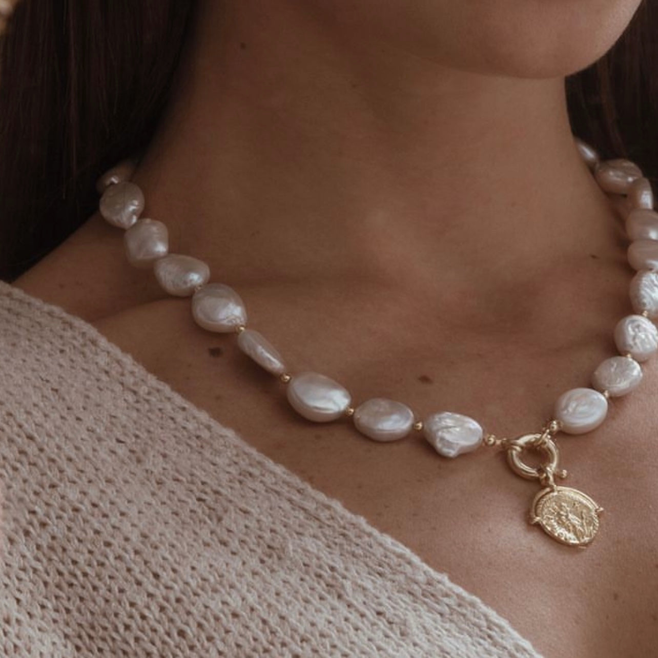 La collana descritta è un girocollo di lunghezza di 50 cm, con perle barocche e un ciondolo con moschettone a cui è attaccata una moneta rimovibile in argento 925 placcato oro. L’argento 925 indica che il gioiello è in argento puro al 92,5% e il restante è composto da altri metalli. La placcatura in oro consiste in un leggero rivestimento dorato che dona un aspetto più lucido e brillante. Prodotto free nichel.