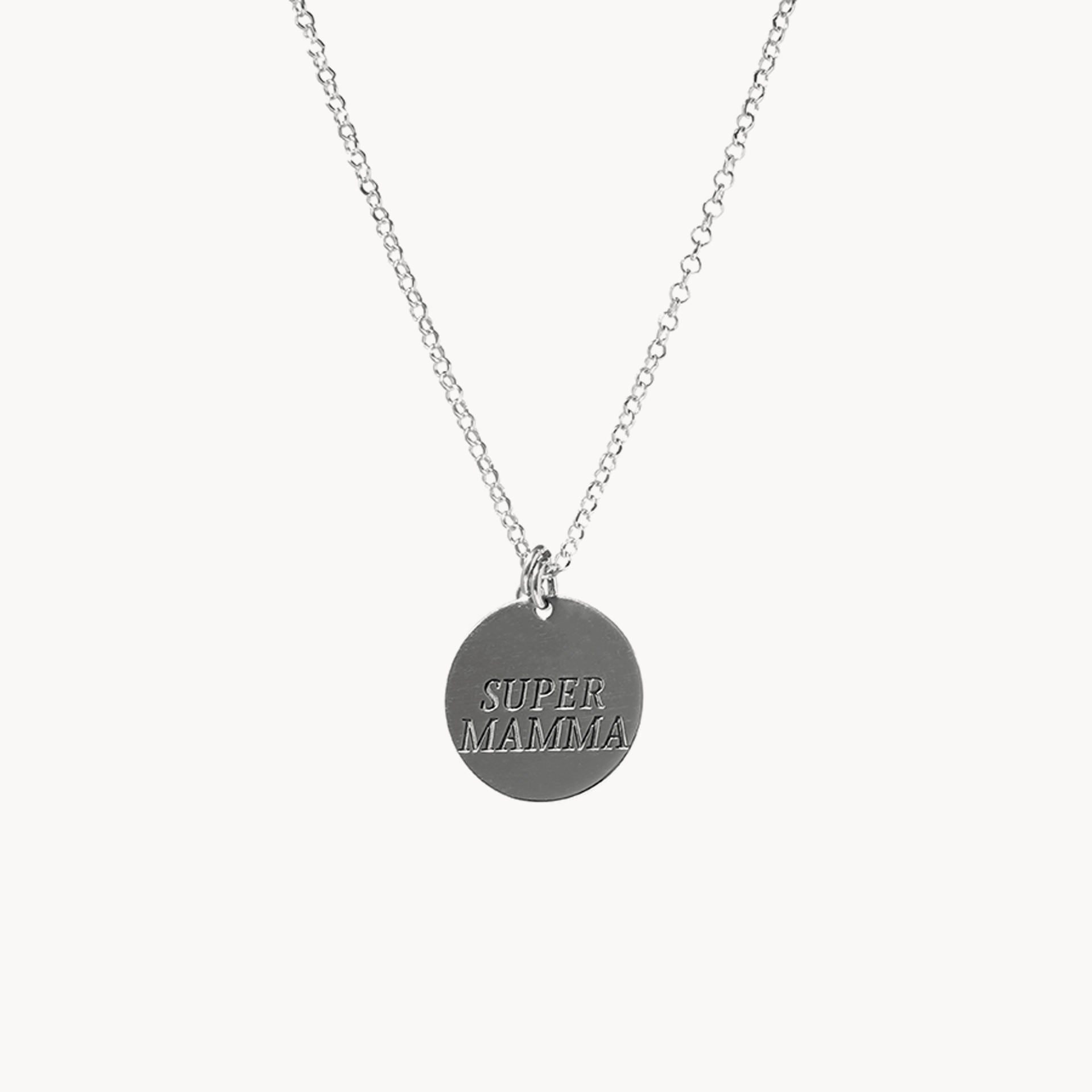 La collana proposta è realizzata in argento 925 e presenta come pendente un ciondolo a forma di cerchio con inciso la frase “Supermamma”. L’argento 925 indica che la collana è stata realizzata al 92,5% in argento e il restante in altri metalli. Un'opzione elegante e discreta da regalare il giorno della festa della mamma oppure in qualsiasi momento per dimostrare il proprio amore. Prodotto free nichel.