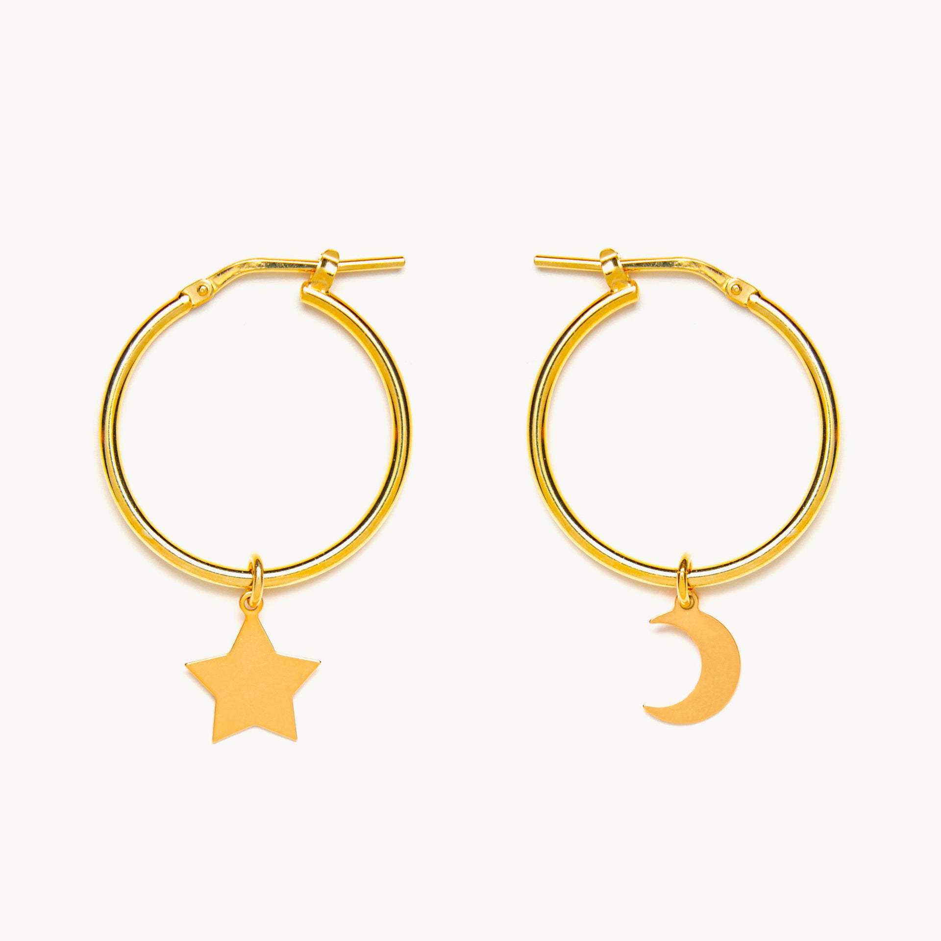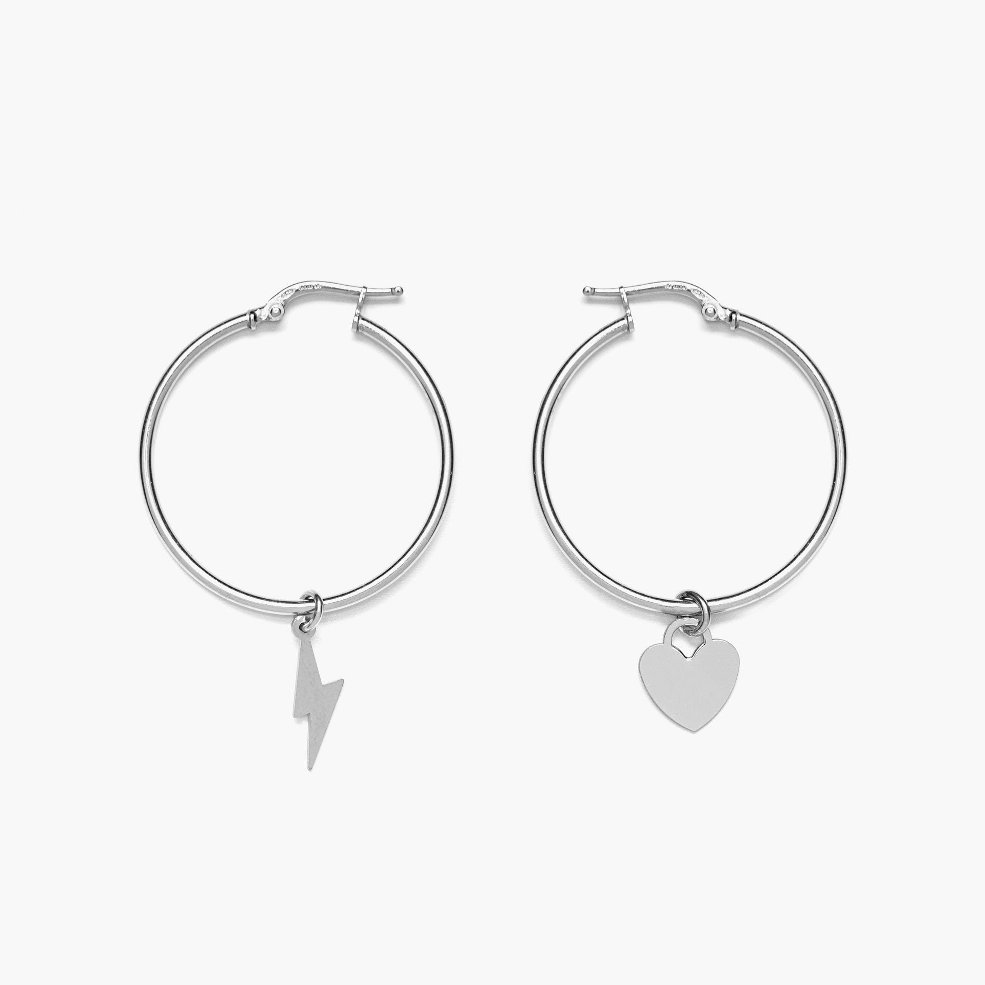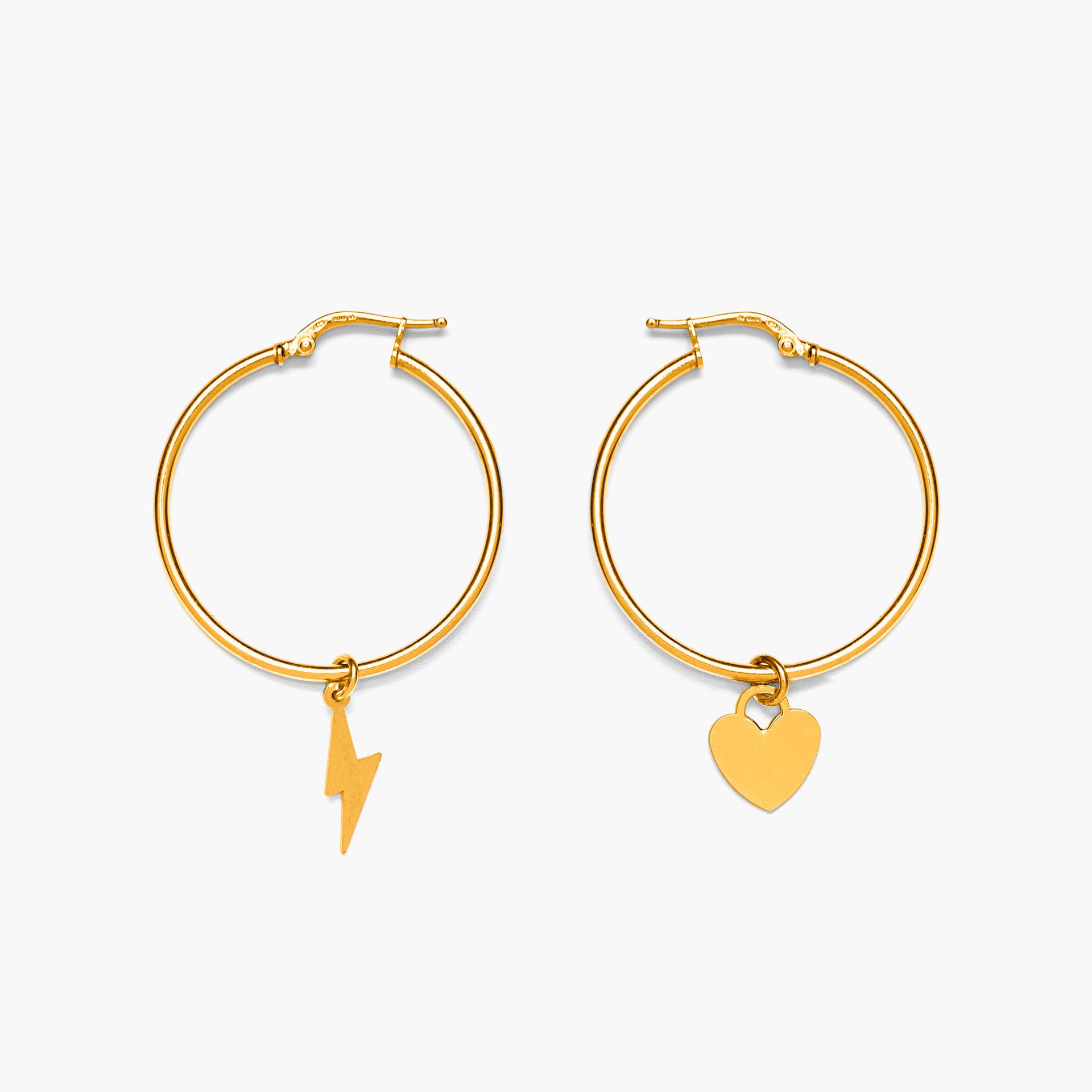 Orecchini in argento al 92,5% a cerchio con chiusura a ponte, una chiusura molto agevole e facile da agganciare. Il placcato oro conferisce all’orecchino un aspetto brillante e prezioso. Come suggerito dalla foto sono disponibili con diversi ciondoli cuore, fulmine, quadrifoglio, stella o lettera incisa. Prezzo a coppia. Prodotto free nichel.